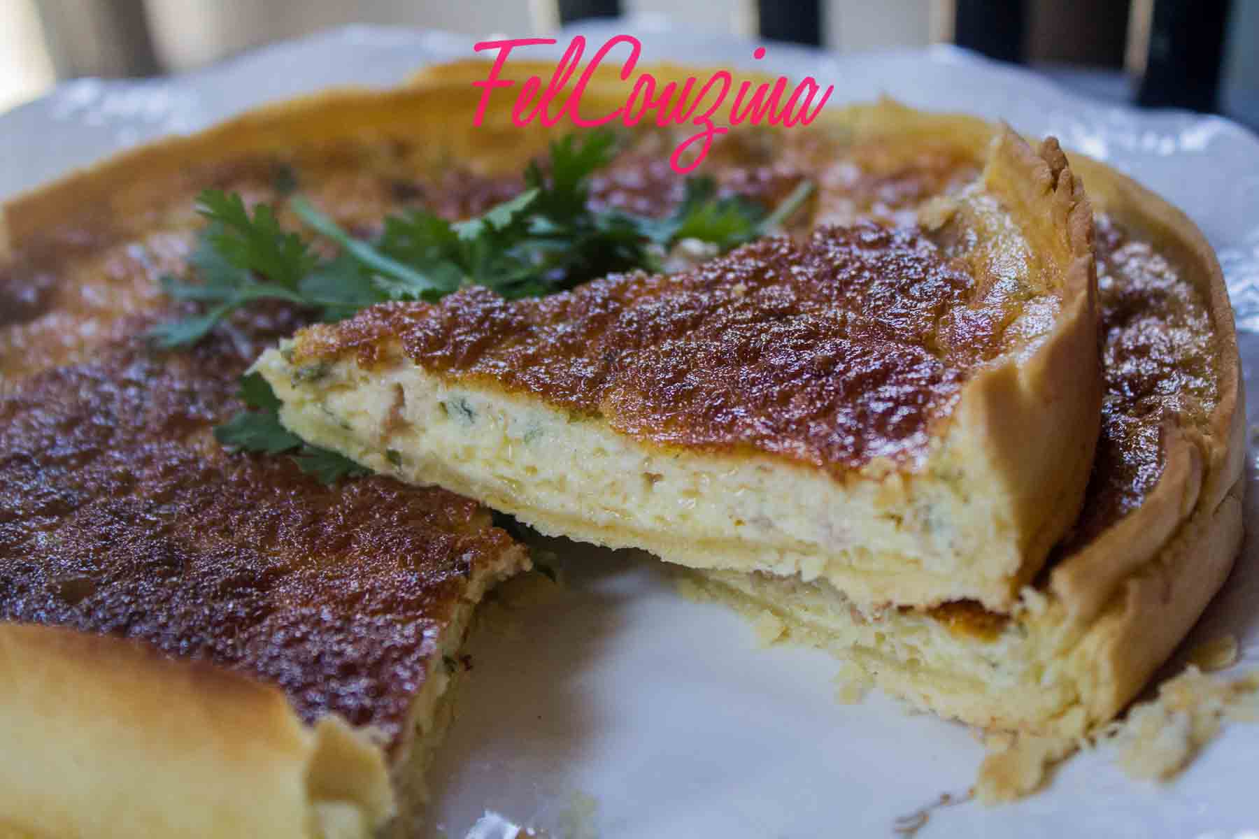 Cette version de la tarte au thon est rapide à réaliser. Pas de béchamel à préparer. La farce est composée de thon d’oeufs et de crème fraiche, le tout sur une pâte brisée maison